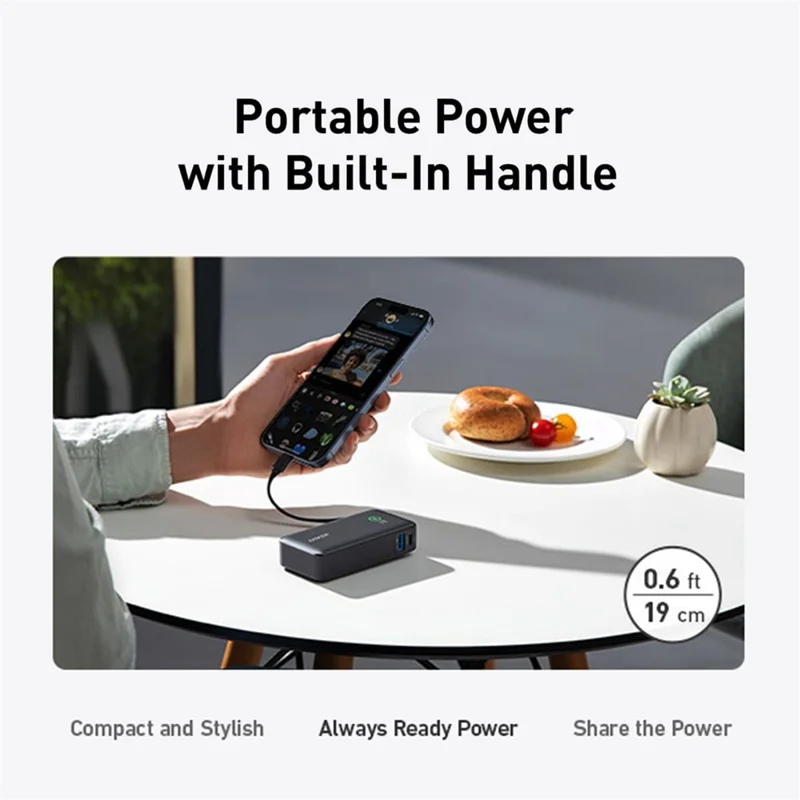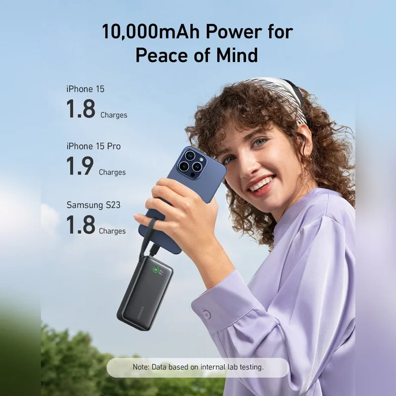 پاوربانک Anker Nano با ظرفیت 10,000 میلیآمپر ساعت و توان 30 وات (مدل A1259H11) یک شارژر قابل حمل با طراحی فشرده و کابل USB-C داخلی است.