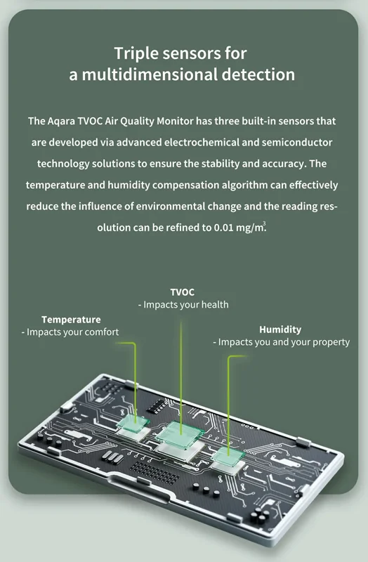 مانیتور کیفیت هوای Aqara TVOC یک دستگاه پیشرفته برای نظارت بر کیفیت هوای داخلی است که با استفاده از فناوریهای الکتروشیمیایی و نیمههادی، سه پارامتر مهم را اندازهگیری میکند: