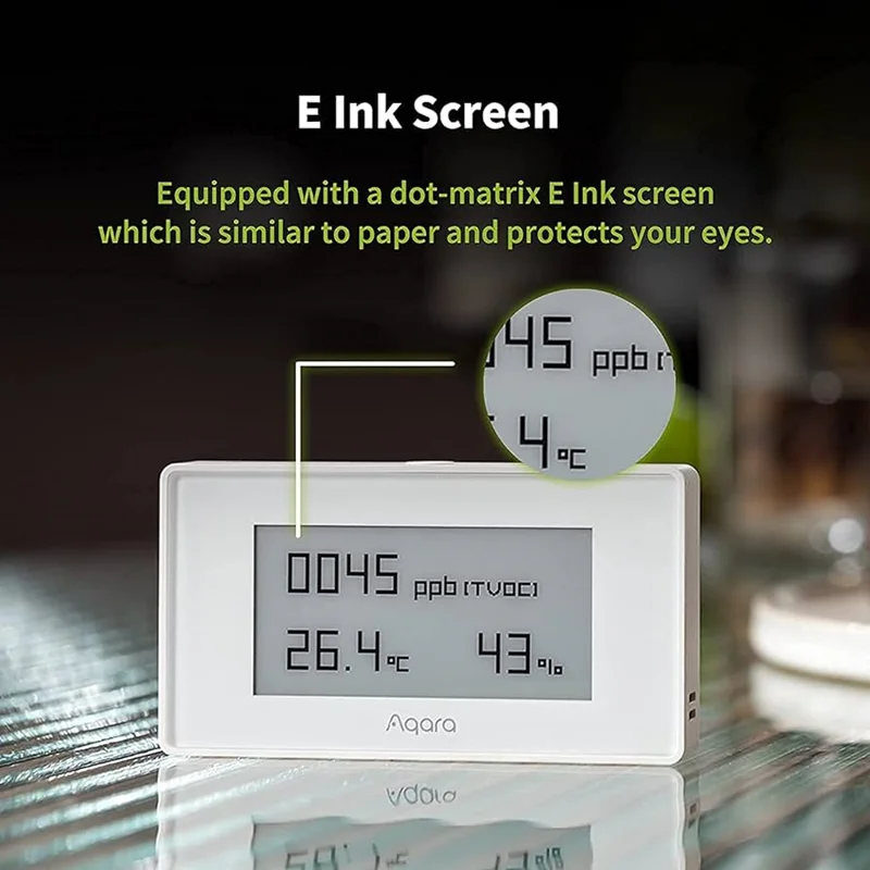 این دستگاه مجهز به صفحه نمایش E Ink است که مشابه کاغذ بوده و برای چشمها راحت است. این نمایشگر با مصرف کم انرژی، امکان مشاهده طولانیمدت اطلاعات را فراهم میکند. همچنین، با استفاده از یک دکمه، میتوان نمایشهای مختلفی از کیفیت هوا را مشاهده کرد.