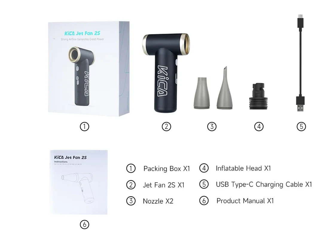 دستگاه Kica Jet Fan 2S مدل KICAAM07 یک دمنده هوای قابل حمل و قدرتمند است که برای تمیز کردن، خشک کردن، باد کردن و گردگیری طراحی شده است.