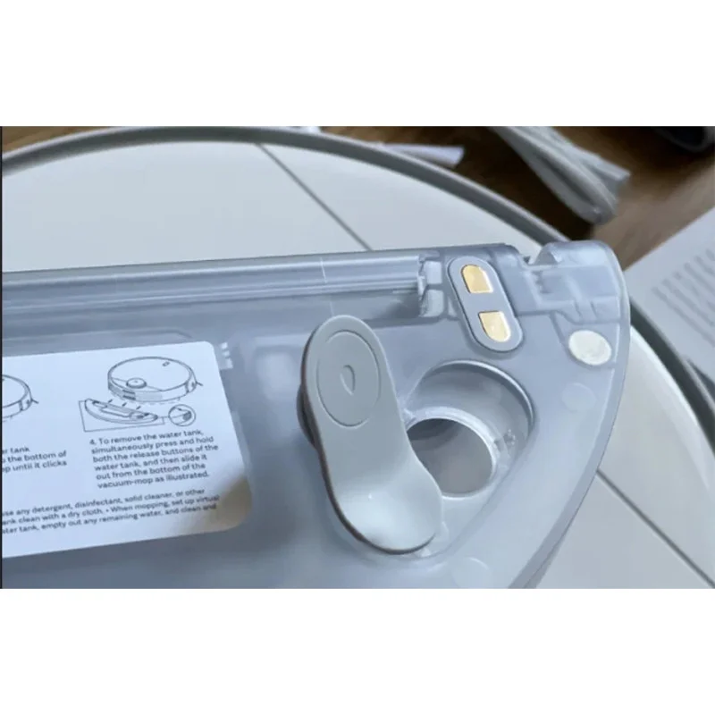 البته باید توجه داشت که با وجود باریک بودن و کوچکتر بودن Mop 2 Pro نسبت به نسخههای پیشین ساختار بسیار محکم و مواد استفاده شده در آن کیفیت بسیار مطلوبی دارد، تنها ایراد طراحی در این محصول را میتوان استفاده پلاستیک براق و مات به صورت متناوب در بدنه آن نام برد، این بدنه گرد و غبار را به خود جذب میکند و برای تمیز کردن دستگاه لازم است هر دو روز یکبار آن را گردگیری کنید. در بالای دستگاه سنسور ناوبری بصری، دکمه هوم و دکمه پاور قرار دارند، در پایین دستگاه نیز سنسورهای ارتفاع، چرخهای همه جهتِ، کنتاکتهای شارژ، سنسور نوری، برس جانبی و اصلی و چرخها قرار گرفتهاند. با برداشتن درب دستگاه متوجه LED وضعیت وای فای، دکمه تنظیم مجدد و مخزن اصلی میشویم با بررسی بیشتر به نمای جلویی دستگاه میرویم که دوربین دیگر با سنسور TOF روی آن قرار گرفته و در اطراف دستگاه نوار بالشتکی ضدضربه تعبیه شده است، در پشت دستگاه نیز میتوانید ورودی هوا با بلندگوهای یکپارچه را مشاهده کنید.