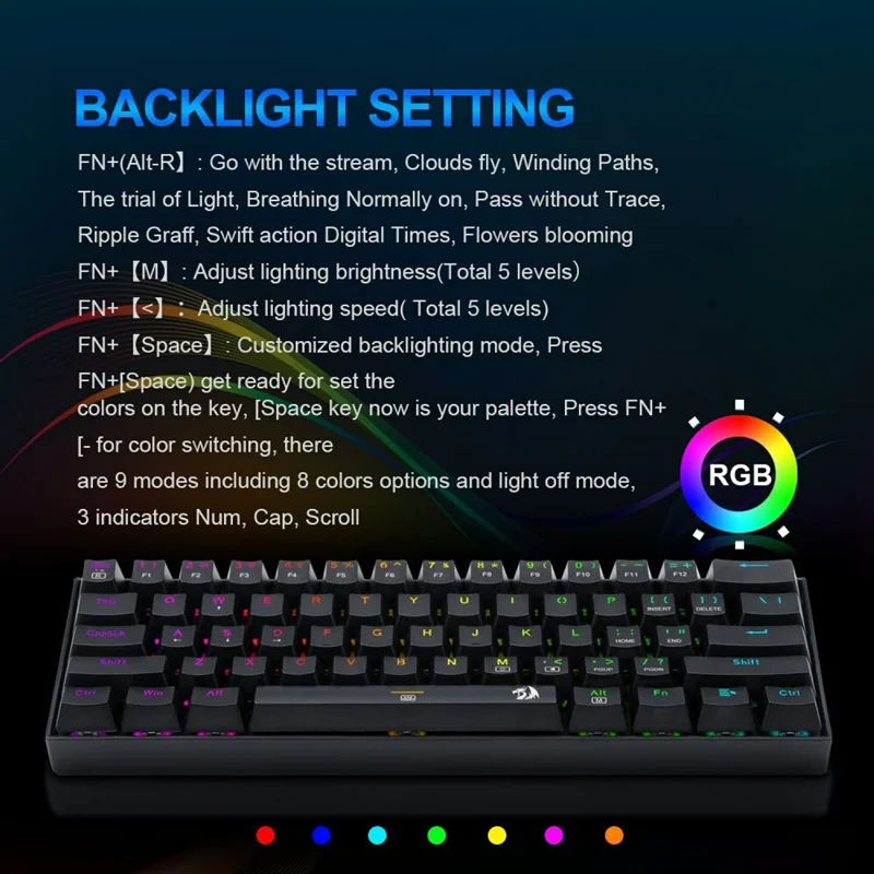 کلیدهای ۶۰% سیمی و ۲ رنگ: صفحه کلید Redragon 60% در حالت سیمی با طرح بندی کلیدهای ترکیبی دو رنگ. ۶۱ کلید فوقالعاده فشرده ، فضای با ارزش میز را با عناصر پر جنب و جوش مانند نورپردازی و طراحی شیک زیبا تر میکند.